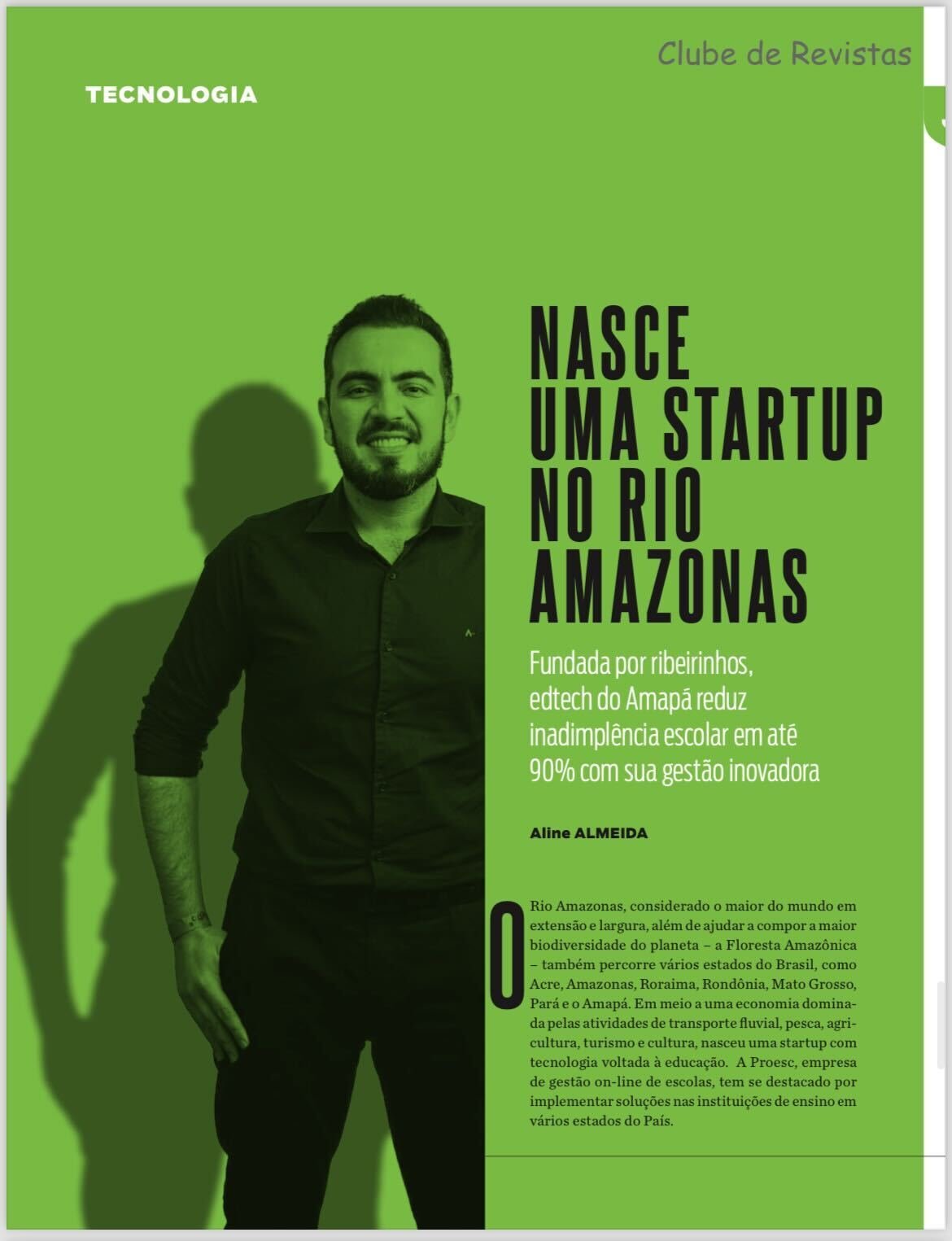 A matéria apresenta Felipe Ferreira, filho de ribeirinho, CEO e um dos fundadores da Proesc. A empresa otimiza a gestão escolar para que professores e gestores possam focar na qualidade da educação.